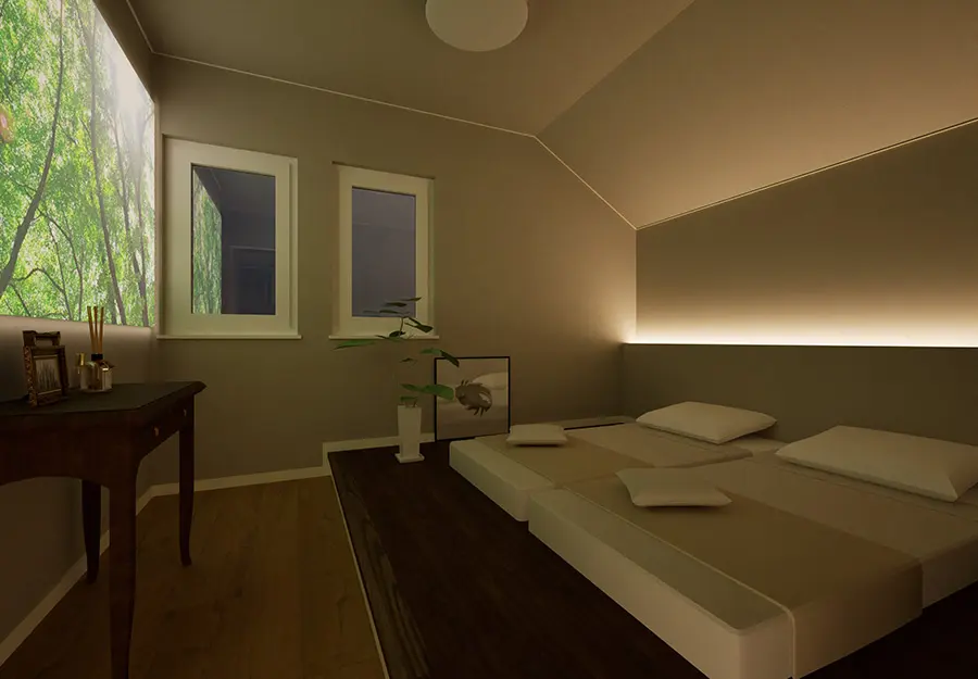 夜は壁にプロジェクターを投影して、寝ころびながら家族みんなでシアター時間を楽しめる寝室です。