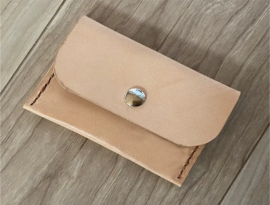 レザークラフト初心者歓迎。ヌメ革で作る手縫いの小物入れ。革に目打ちで穴を明け、カード入れにもなる革製品を作ります。