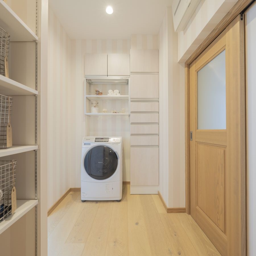 将来の自宅介護まで想定した間取りです。水廻り↔︎寝室のアプローチをはじめ、ぐるっと回遊できる動線設計など、一階を中心とした空間です。少ない置家具でも豊かに暮らせるアイデアが満載です。