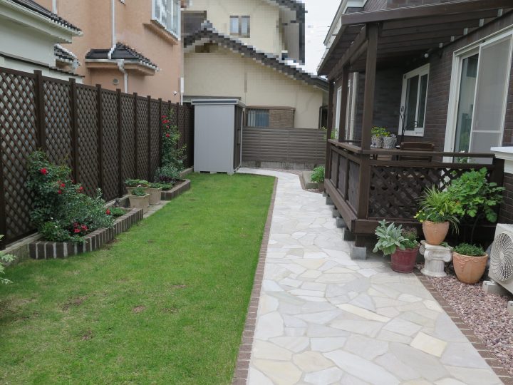 歩行スペースも玄関アプローチと同じ石張りで統一感を出しました。植物が大好きな奥様が、どこにどんな植物を配置するかを考え、プランを作っていきました。