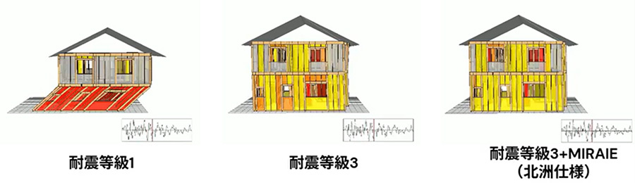 北洲仕様(サステナブル耐震®)、耐震等級3、耐震等級1の3パターンの住宅に、当社が実施する揺れを加え、比較したシミュレーションの動画です。動画は東日本大震災2回後の極稀地震の揺れから始まり、耐震等級1が地震直後に大破して居住不能、耐震等級3も住み続けるのが危険な状態となった一方で、北洲仕様の家は全ての揺れを経ても居住者の生命を守れる耐力を有する、高い性能を示す結果をご覧いただけます。