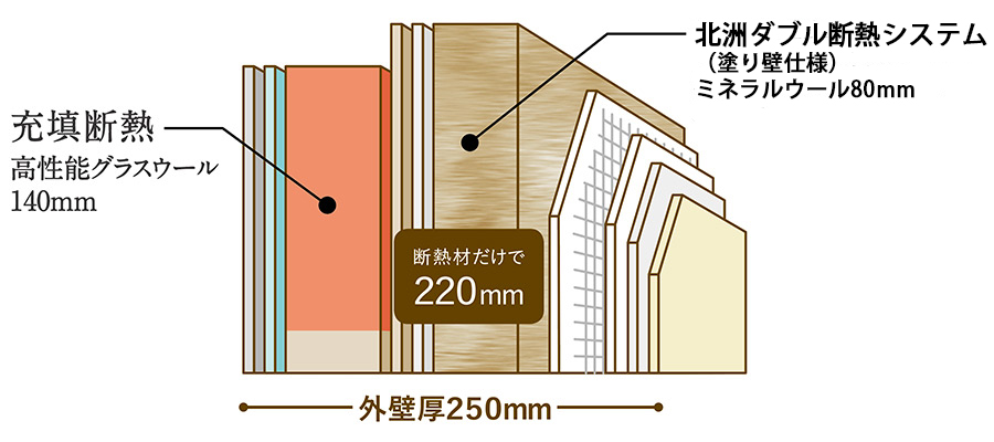 不燃の外張り断熱材ミネラルウォール・ラメラ80㎜を用いたシステムは、充填断熱と合わせて220㎜。外壁の厚みは250㎜にもなります。
