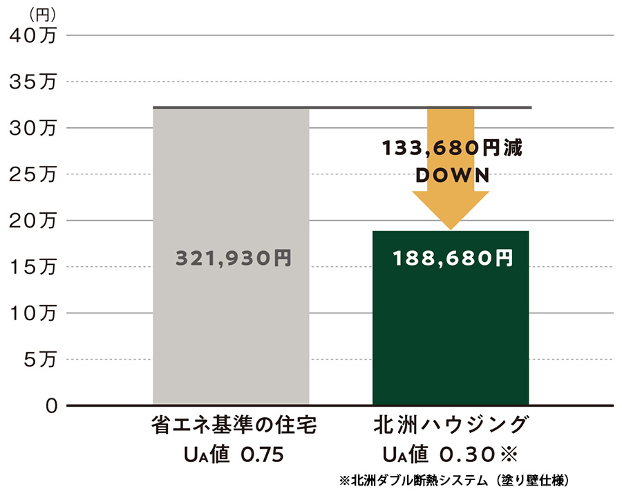 省エネ基準の住宅はガス・電気併用、北洲ハウジングはオール電化での比較となります。